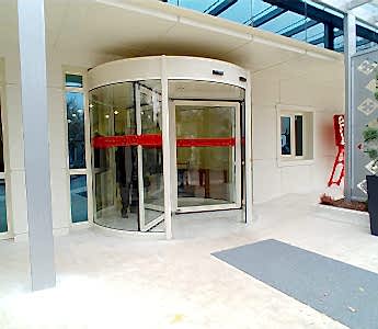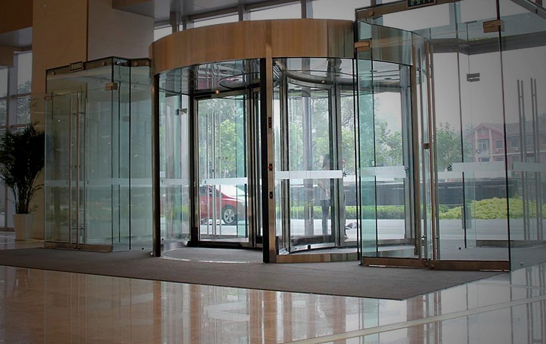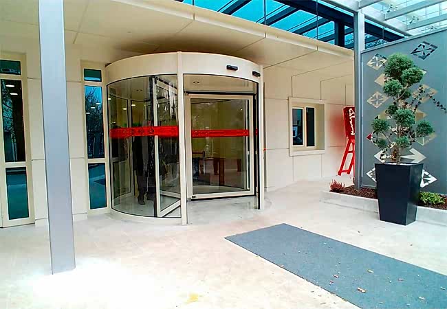 Azerbaycan'da modern görünümlü otomatik döner kapılar, sabit dairesel yan panellerle merkezde mile bağlı veya konsol ile döner tam daire şeklinde üretilir.